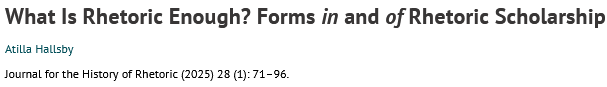 This article poses the question, What is rhetoric enough? as a provocation about the hurdles emerging scholars must traverse. The first is fear that their scholarship is not “enough” to meet the topical, theoretical, and evidentiary standards of rhetoric studies, while the second is the criticism that there is “too much” rhetoric in communication scholarship. Together, these create a wicked polarity. This article answers this question by drawing on the strategy of prepositional criticism, which posits “both/and” answers as affirmative rejoinders to “either/or” framings of rhetoric’s grounding in either tradition or transformation. To that end, it offers five provisions that elaborate distinct forms in and of rhetoric scholarship: (1) rhetoric can be understood as a contained feature in and productive effect of discourse; (2) exigencies define the context in and purpose of scholarship; (3) theory is embedded in and an enactment of rhetorical criticism; (4) community is invoked in and a creation of academic discourse; and (5) citation can be thought of as a way to document scholars’ due diligence in their writing and as an active habit or practice of constituting a conversation.