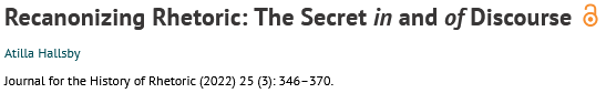 Challenges to rhetoric’s canon often occur under the rubric of revising that canon and its foundational, shared meaning. Read through the strategies of deconstruction, the secret offers a common ground for recanonizing approaches by centering either a concealed quantity in ancient rhetoric’s granular archive (the secret in discourse) or an unfolding idea whose transformation has rendered it unrecognizable to its original version (the secret of discourse). This article draws on Jacques Derrida’s “White Mythology” (1974) and A Taste for the Secret (2001) before addressing how the secret’s registers in and of discourse animate de- and recanonizing readings of ancient Greek and Roman rhetoric. Its implications address scholars distressed by the durable forms of oppression ensconced in rhetoric’s ancient canon.
