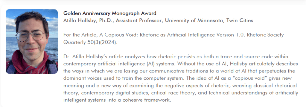 I’m honored to have received the National Communication Association’s Golden Anniversary Monograph Award for my essay, “A Copious Void: Rhetoric as Artificial Intelligence 1.0”!
