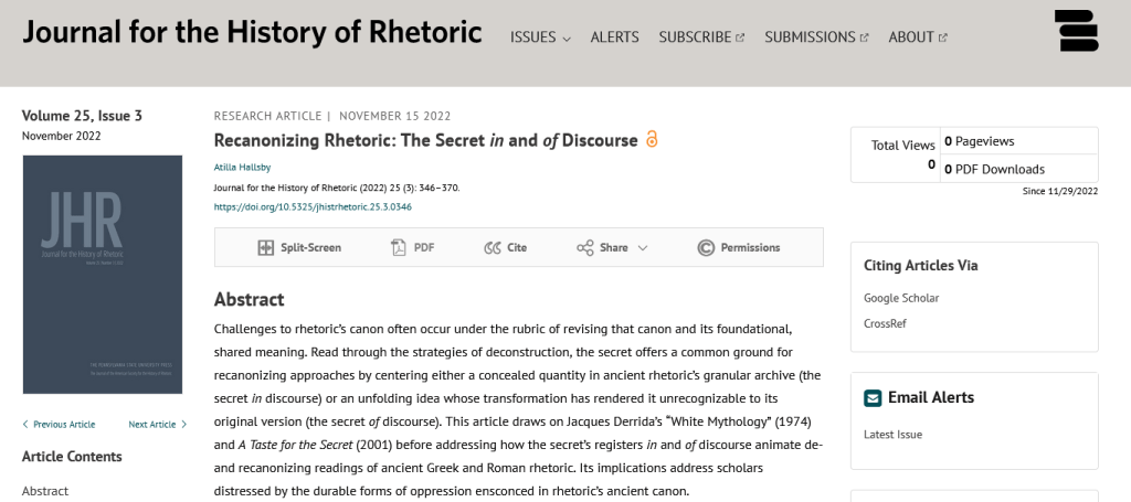 “Recanonizing Rhetoric: The Secret IN and OF Discourse” in the Journal for the History of Rhetoric